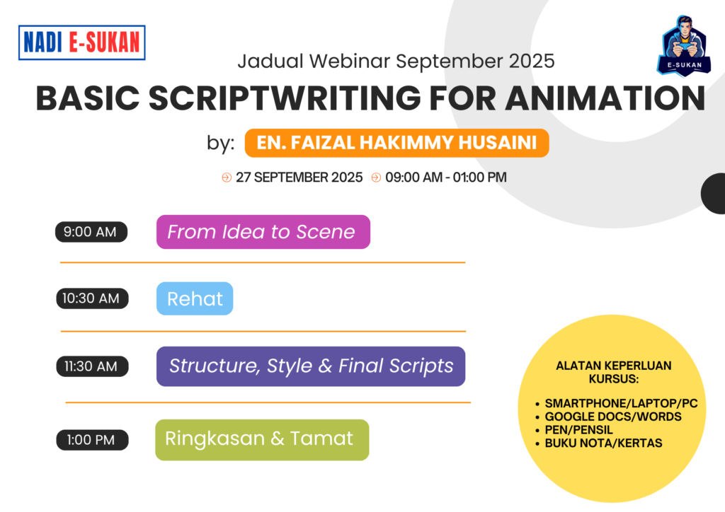 Jangan lepaskan peluang menyertai webinar menarik bersama En. Faizal Hakimmy Husaini khusus untuk anda yang nak belajar asas penulisan skrip animasi!