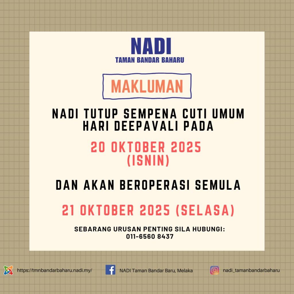 Sukacita dimaklumkan bahawa NADI Taman Bandar Baharu akan tutup pada 20 Oktober 2025 (Isnin) sempena cuti umum Deepavali.